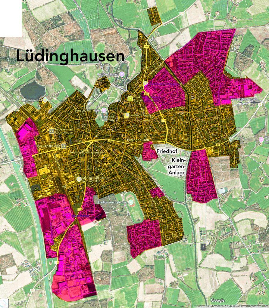 Unser Klassentreffen anlässlich 50 Jahren Entlassung aus der Grundschule hat meinen Fokus mal auf Lüdinghausen gerichtet. Und so habe ich einen Stadtplan reproduziert, der auf das Jahr 1977 datiert, und via Google Maps mit dem heutigen Status Quo verglichen – um festzustellen, dass zwei Fünftel der heutigen Siedlungsflächen (Wohn- und Gewerbegebiete) NEUZUWACHS innerhalb der vergangenen 50 Jahre sind. – (Informell: Hierbei habe ich nur die Kernstadt verglichen, also ohne den Ortsteil Seppenrade; diesen Ortsteil abgezogen werden Lüdinghausen knapp 19.000 Einwohner zugerechnet.) – Nun ist das natürlich nur EINE – und eine kleine – Stadt unter vielen in Deutschland. Darüber hinaus hatte Lüdinghausen mit der Kreisreform von 1975 seinen Status als Kreisstadt verloren und stufte zu einem Subzentrum im westlichen Münsterland herab.